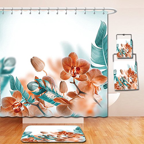 Nalahome Bath Suit: Showercurtain Bathrug Bathtowel Handtowel Tropical Decor Tropical Orchids Blossom Leaves on Blurred Background Floral Themed Modern Art Orange Teal through an online shopping site.
